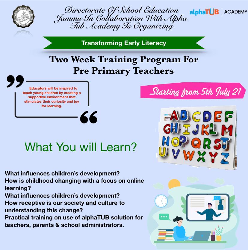 Jammu: On Directorate of School Education Jammu in collaboration with Alphatub academy is organising 2-week online program for Pre-primary teachers in the use of customised Alphatub alphabet board, which are being distributed to 50 Pre-primary schools, free of cost by Alphatub private Ltd.