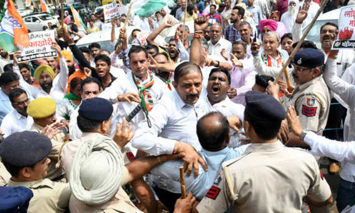 The police forcefully removed protesting Congress workers when they sat on a road in Sector 19.