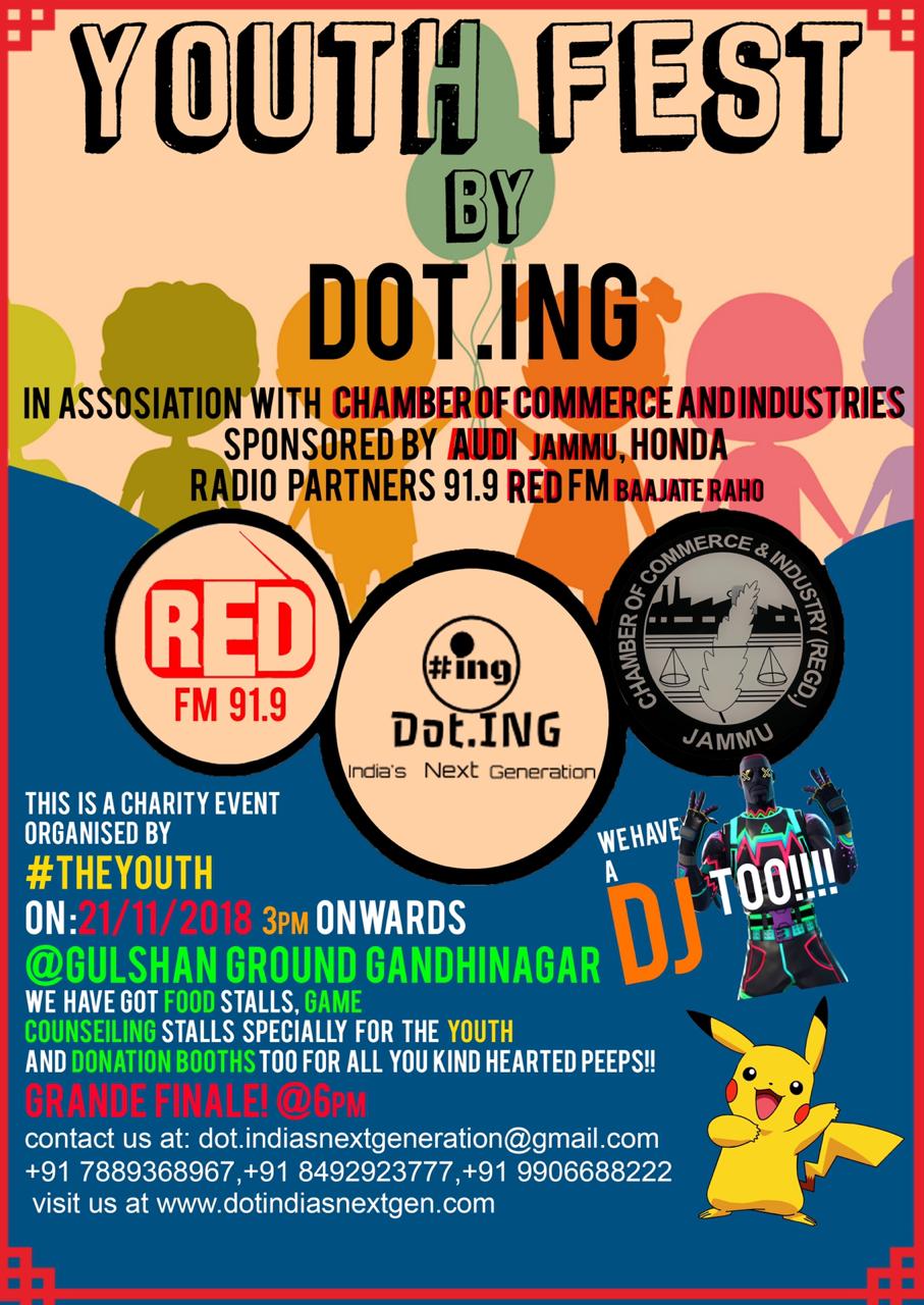 In yet another attempt, to help the downtrodden of the society, the kids of dot.ING are organizing a youth festival on Wednesday 21st Nov. 2018 from 3.00 pm to 8 pm at Gulshan ground Jammu. This festival is being organised with support of Chamber of commerce Jammu.