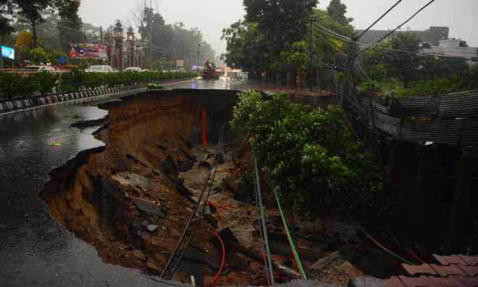 - A large section of the Mall Road, near the MC Commissioner’s office, caved in due to heavy rain in Amritsar on Sunday.