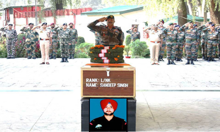 Army on Tuesday paid tributes to Lance Naik Sandeep Singh who was killed in a gunfight with the militants in Tangdhar area of frontier district of Kupwara on September 22.