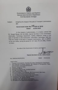 J & K Saugat Biswas to hold additional charge of Transport Commissioner By Paigaam News - September 25, 2018 397 Facebook Twitter Google+ Pinterest WhatsApp