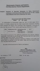 J & K Payment of dearness allownace to state goverment employees continuing to draw their pay as per 6th cpc- revised rates effective from 1 January 2018 to 1 July 2018 By Paigaam News - September 25, 2018 425 Facebook Twitter Google+ Pinterest WhatsApp