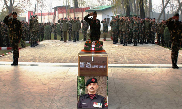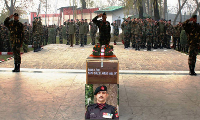 Army on Monday paid a floral tribute to Lance Naik Nazir Ahmed Wani who was killed in a gunfight with the militants in south Kashmir’s Shopian district yesterday.