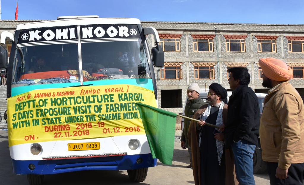 KARGIL, NOVEMBER 28, 2018: – Chairman and Chief Executive Councillor LAHDC, Kargil Feroz Ahmed Khan along with the Executive Councillor for Horticulture Aga Syed Mujtaba today flagged off a group of 40 farmers to Leh for exposure and training on latest interventions in Horticulture under the centrally sponsored schemes Mission for Integrated Development of Horticulture (MIDH) and Agricultural Technology Management Agency (ATMA).