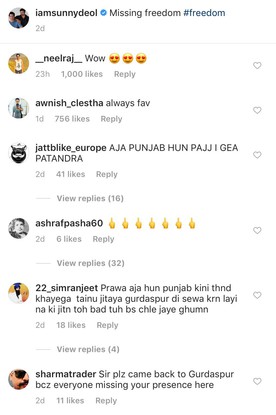 Screenshot of the comment section of Sunny Deol’s Instagram video.