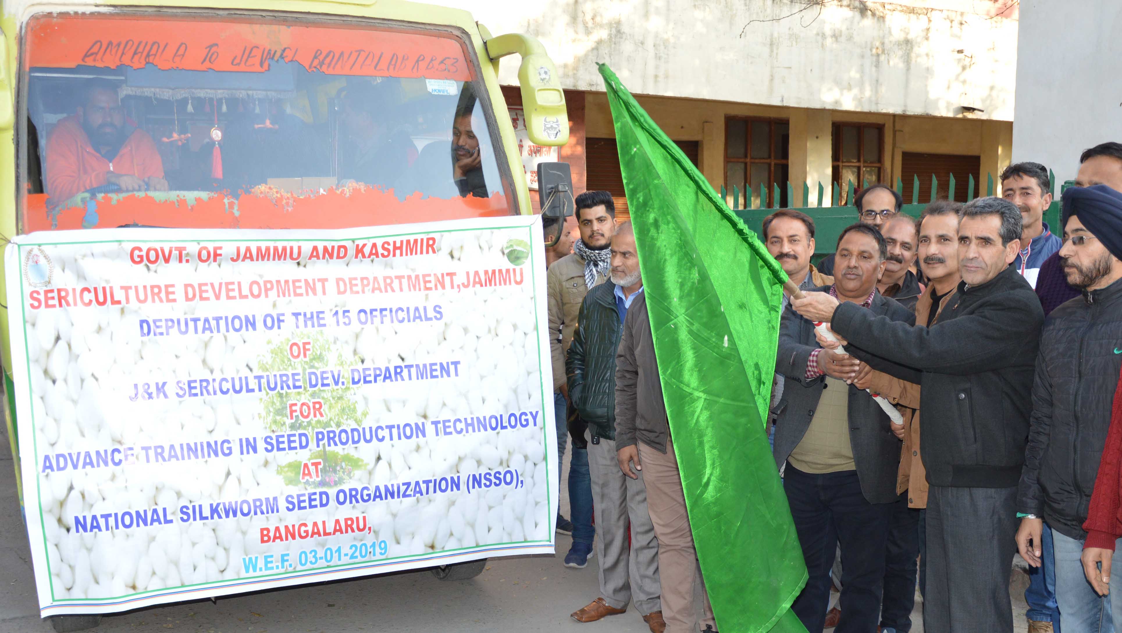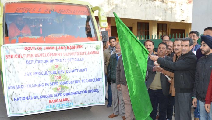 JAMMU, JANUARY 03: Director Sericulture Gulzar Ahmad today flagged-off a batch of 15 officials of the Department for specialized training in seed technology at National Silkworm Seed Organization (NSSO), Bengaluru.