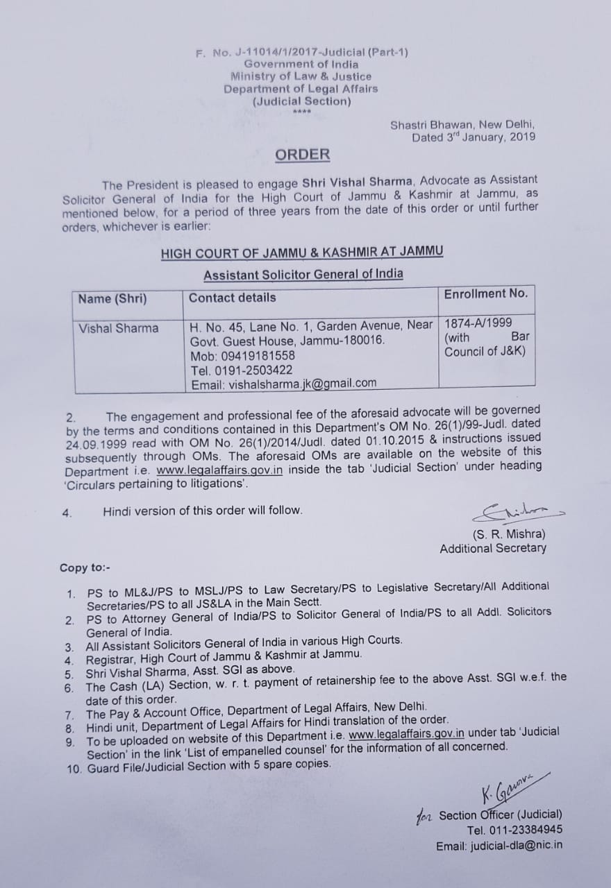 Breaking NewsJ & K President engages Vishal Sharma as Assistant Solicitor General of India for the High Court of Jammu And Kashmir at Jammu By Paigaam News - January 4, 2019 553 Facebook Twitter Google+ Pinterest WhatsApp File Photo
