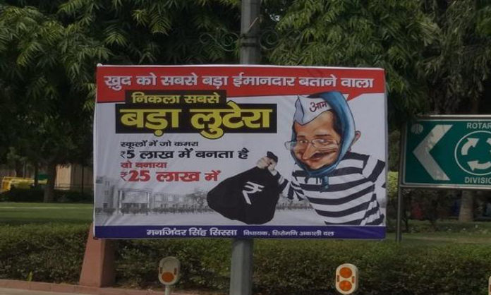 New Delhi, July 4: Posters accusing Delhi Chief Minister Arvind Kejriwal of corruption and theft surfaced in the national capital on Thursday. The posters were installed by Shiromani Akali Dal (SAD) leader and Rajouri Garden MLA Manjinder Singh Sirsa. He has accused the Aam Aadmi Party (AAP) Convener of constructing Delhi schools at a much higher price than the standard cost.