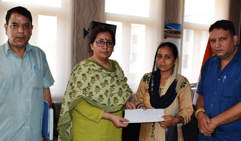 REASI JUNE 04: Deputy Commissioner, Indu Kanwal Chib, today handed over a cheque of Rs 2 lakh as ex gratia compensation to Ramta Devi of Salal Kotli, kin of Raj Singh, son of Budhi Singh who died last year in a road accident at Bidda Morh while on duty. He was working as driver with GREF.