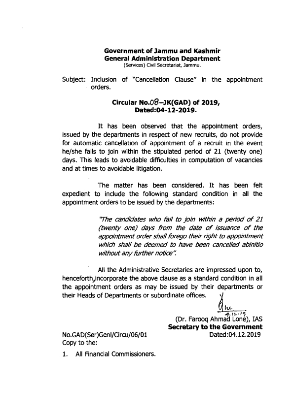 J & K Inclusion of “Cancellation Clauses” in the appointment order By Paigaam News - December 5, 2019 476 Facebook Twitter Google+ Pinterest WhatsApp