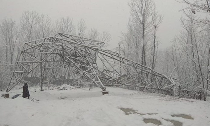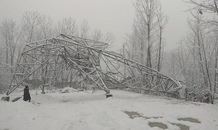 An under-construction transmission tower of Bandipora grid station collapsed on Thursday in Ajas area due to heavy snowfall.