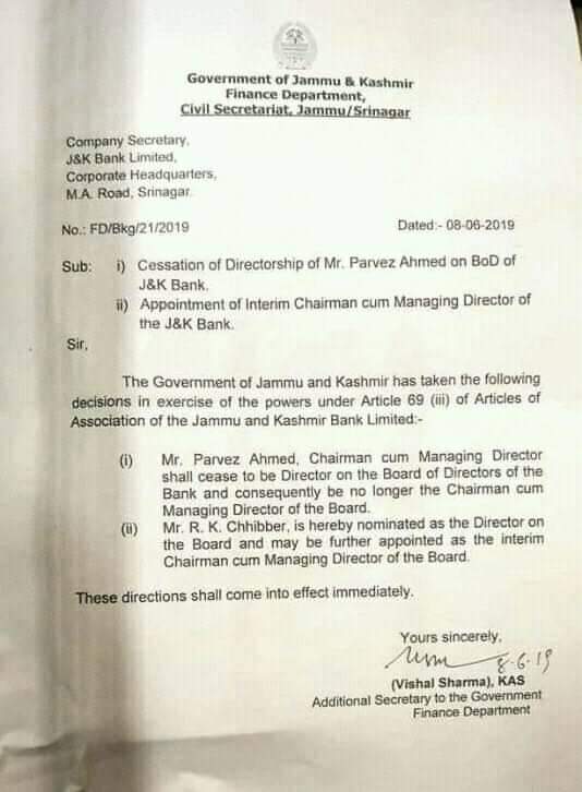 Breaking NewsJ & K JnK Bank Chairman removed, R K Chhibber takes over By Paigaam News - June 8, 2019 512 Facebook Twitter Google+ Pinterest WhatsApp