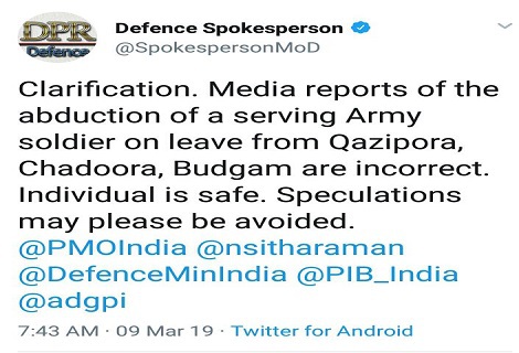 “Media reports of the abduction of a serving Army soldier on leave from Qazipora, Chadoora, are incorrect. (The) individual is safe. Speculations may please be avoided,” a Defence Ministry statement said.