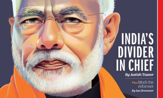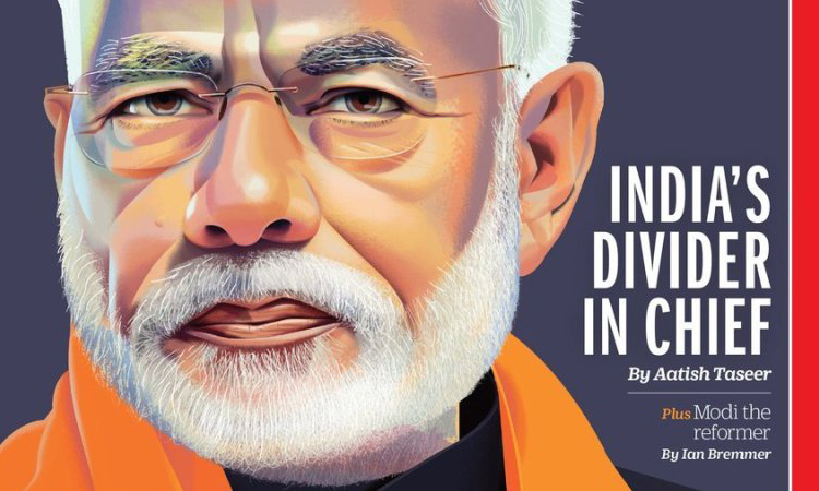 The headline reads “India’s Divider in Chief” that is and carries a caricature of the Prime Minister criticises Modi.