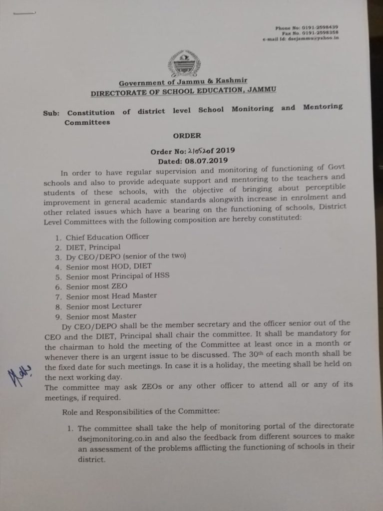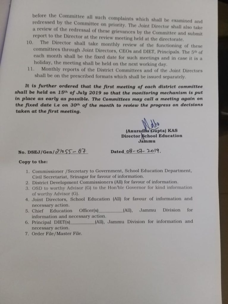 J & K Director School Education Jammu, Ms. Anuradha Gupta Constitutes District Level School Monitoring and Mentoring Committees By Paigaam News - July 10, 2019 689 Facebook Twitter Google+ Pinterest WhatsApp