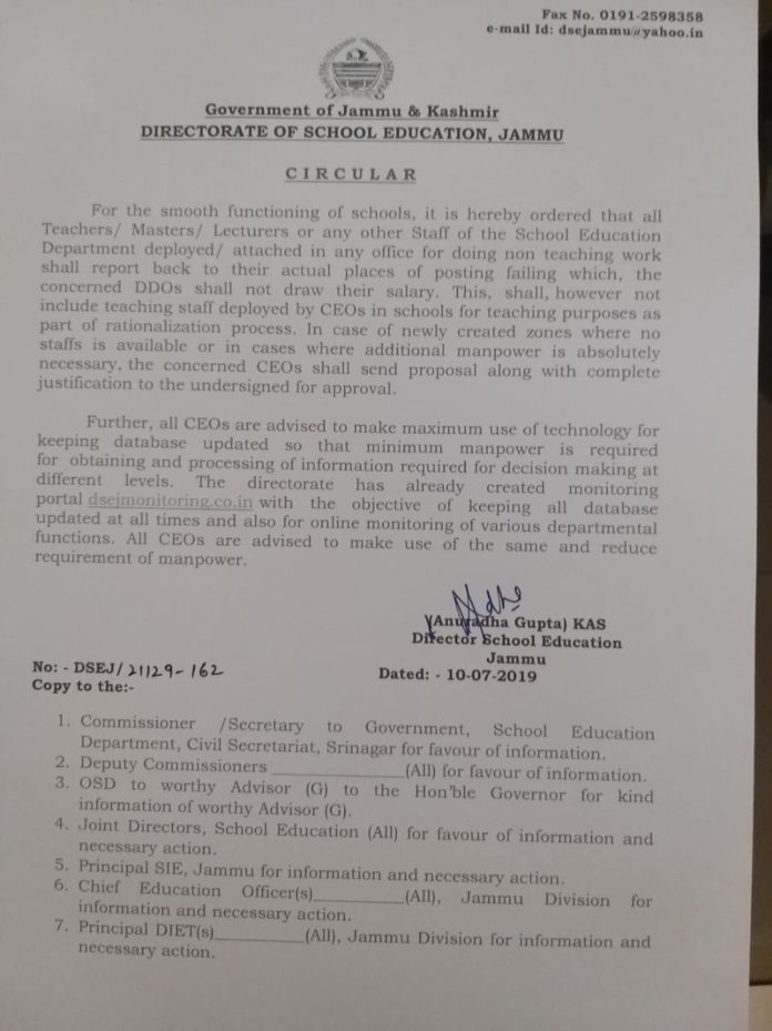 J & K Director School Education Jammu Ms. Anuradha Gupta Cancels All Attachments/ Deployments Of Teaching Staff By Paigaam News - July 10, 2019 1109 Facebook Twitter Google+ Pinterest WhatsApp