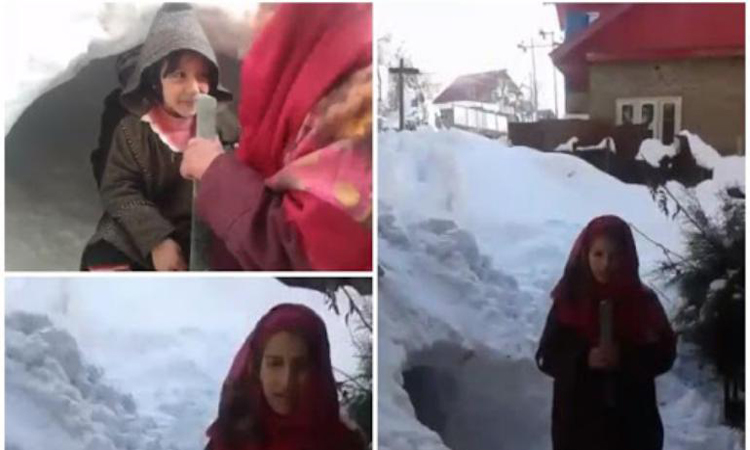 Heavy snowfall has disrupted life in the Valley as roads are blocked and power supplies are cut. But this little girl took this opportunity to don the hat of a journalist to play a weather reporter.