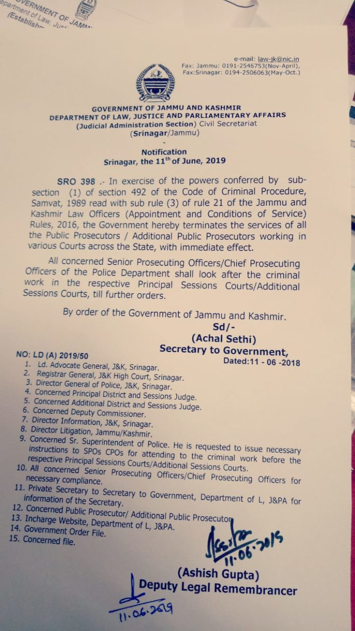 “In exercise of the powers conferred by sub- (1) of section 492 of the Code of Criminal Procedure Samvat, 1989 read with sub-rule (3) of rule 21 of the Jammu and Kashmir Law Officers (Appointment and Conditions of Service) Rules, 2016, the Government hereby terminates the services of all the Public Prosecutors/ Additional Public Prosecutors working in various Courts across the State, with immediate effect,” a notification issued by Department of Law, Justice and Parliamentary Affairs reads.