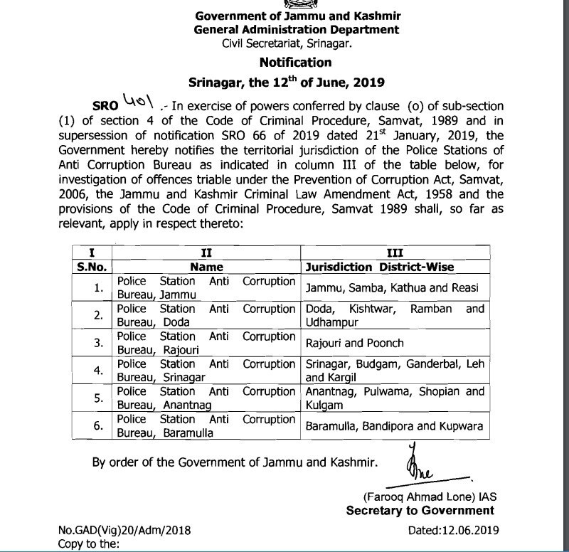 “In exercise of powers conferred by clause (0) of sub-section (1) of section 4 of the Code of Criminal Procedure, Samvat, 1989 and in supersession of notification SRO 66 of 2019 dated 21 January, 2019, the Government hereby notifies the territorial jurisdiction of the Police Stations of Anti-Corruption Bureau as indicated in column I11 of the table below, for investigation of offences triable under the Prevention of Corruption Act, Samvat, 2006, the Jammu and Kashmir Criminal Law Amendment Act, 1958 and the provisions of the Code of Criminal Procedure, Samvat 1989 shall, so far as relevant, apply in respect thereto,” read an order issued by the government on June 12.