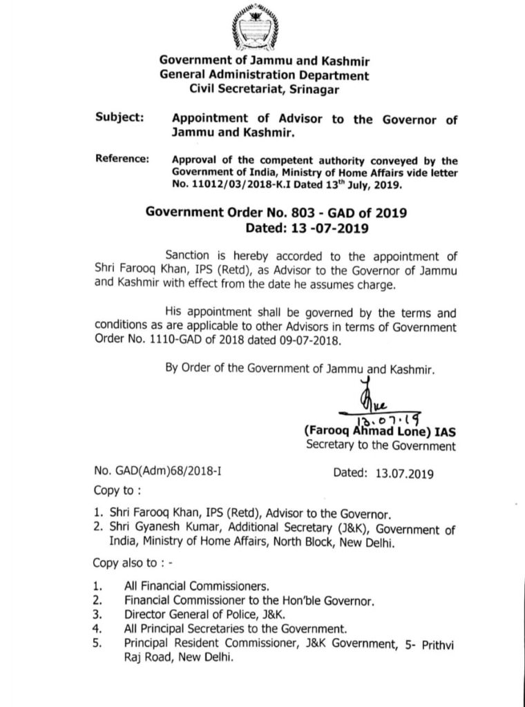 J & K Farooq Khan appointed as Advisor to the Governor of Jammu and Kashmir By Paigaam News - July 13, 2019 742 Facebook Twitter Google+ Pinterest WhatsApp