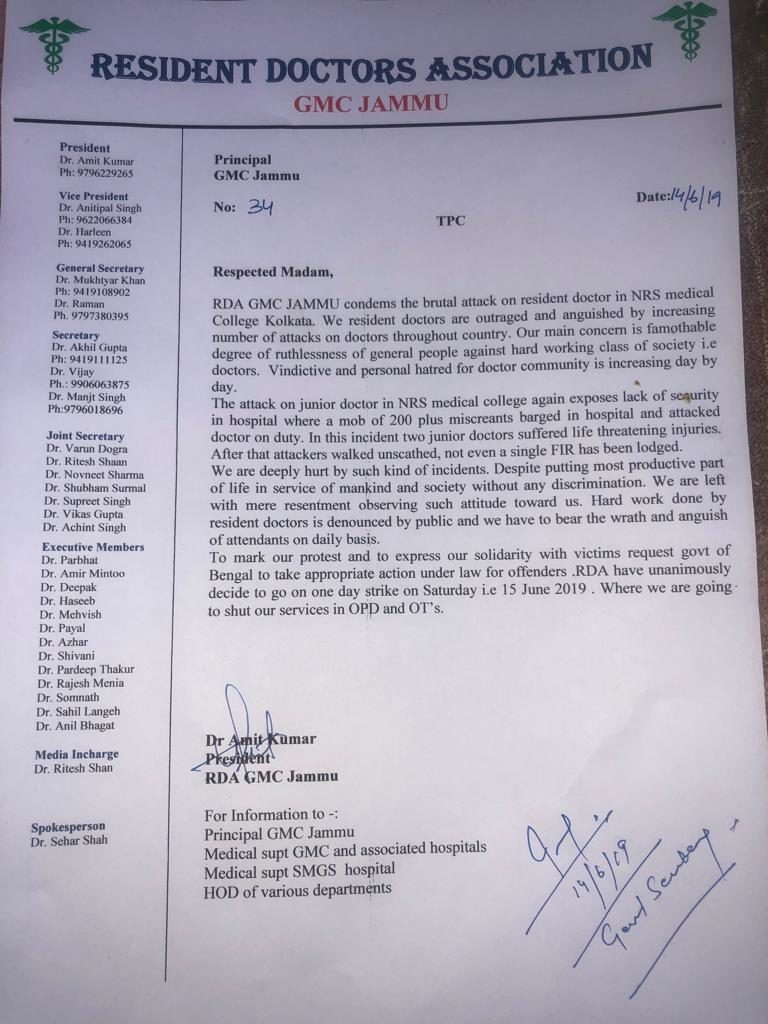 Resident Doctors Association GMC Jammu condemns attack on doctors in NRS Medical College Kolkata