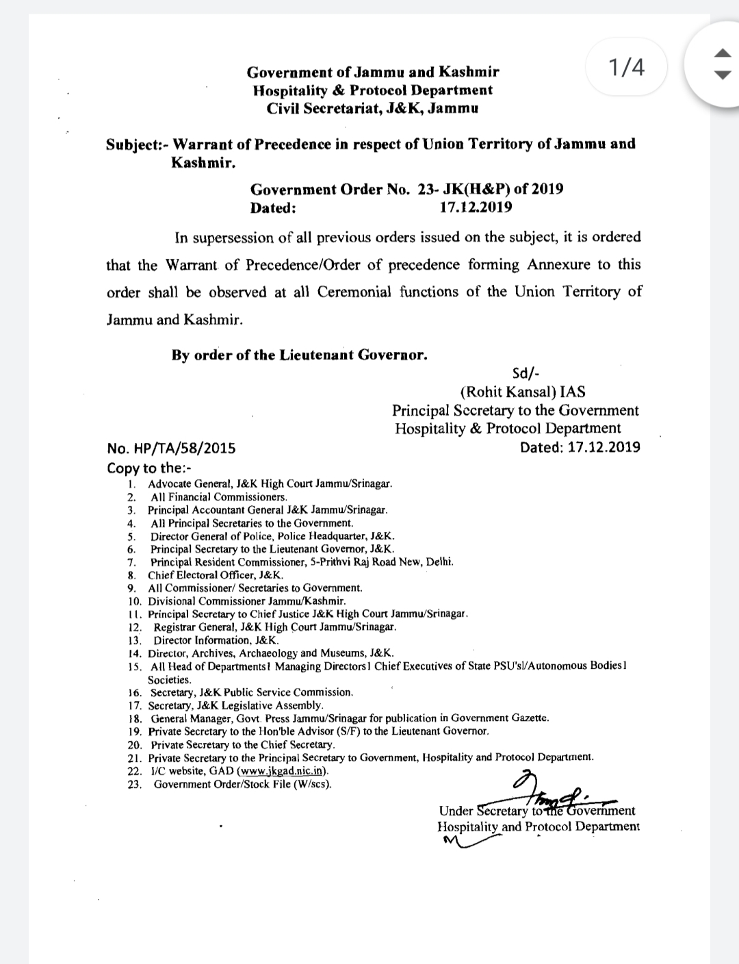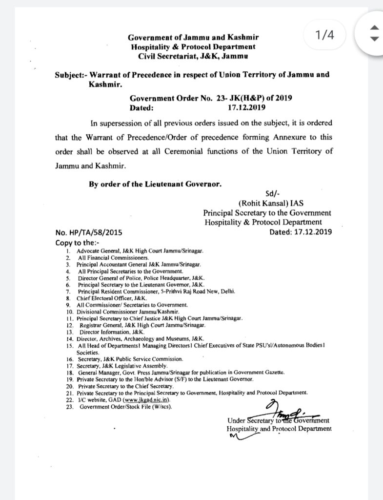 Breaking NewsJ & K WARRANT OF PRECEDENCE IN RESPECT OF UNION TERRITORY OF JAMMU AND KASHMIR By Paigaam News - December 17, 2019 862 Facebook Twitter Google+ Pinterest WhatsApp