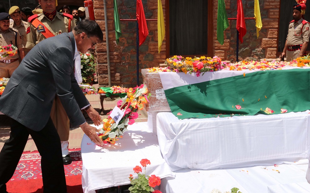 SRINAGAR, JUNE 19: Advisors to Governor, K.Vijay Kumar and K.K Shamra on Monday laid wreaths on the body of slain SHO Arshid Ahmad Khan at District Police Lines, Srinagar.