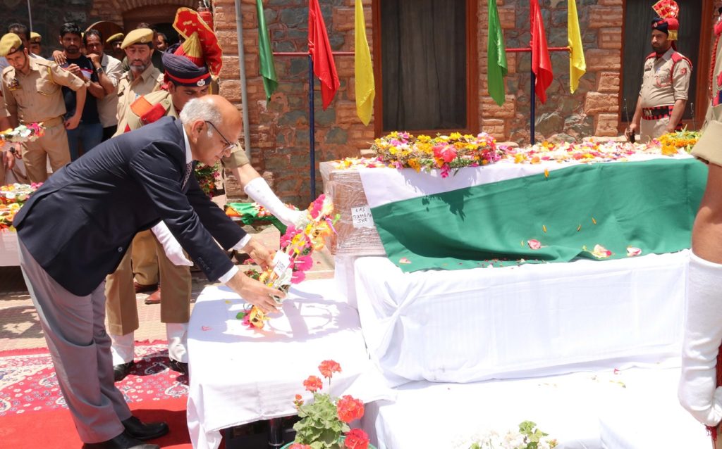 Principal Secretary Home, Shaleen Kabbra, DGP, Dilbag Singh, Divisional Commissioner Kashmir, Baseer Ahmad Khan and Deputy Commissioner, Srinagar, Dr. Shahid Iqbal Choudhary also laid floral wreaths on the mortal remains–paying tributes to the martyr for his supreme sacrifices.