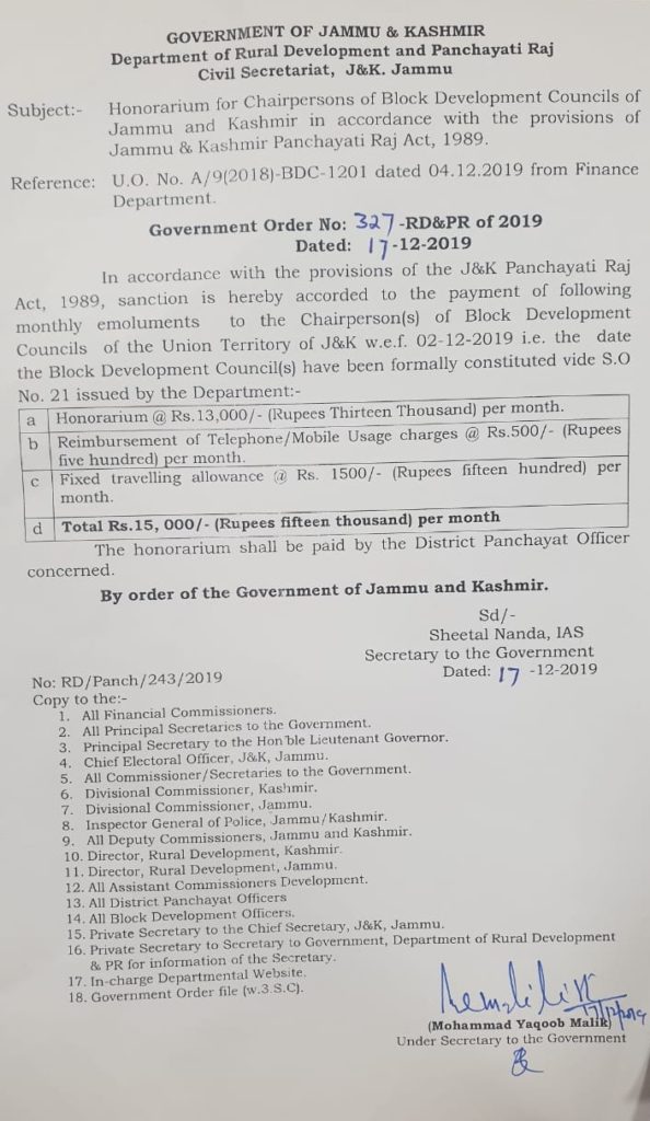 Honorarium for chairpersons of Block Development Councils of Jammu & Kashmir in accordance with the provisions of Jammu & Kashmir Panchayati Raj Act 1989