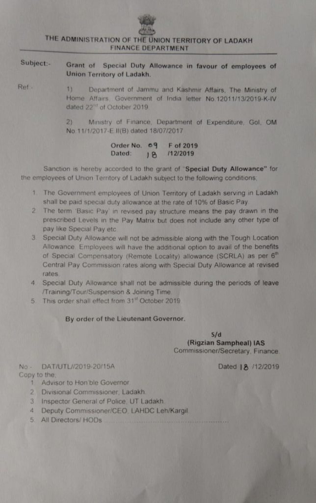 J & K Grant of Special Duty Allowance in Favour of employess of Union Territory of Ladakh By Paigaam News - December 19, 2019 591 Facebook Twitter Google+ Pinterest WhatsApp