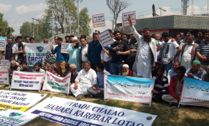 Srinagar, April 22: A traders’ body associated with the cross-LoC trade on Monday staged a protest in Srinagar to demand resumption of the trade between parts of divided Kashmir.