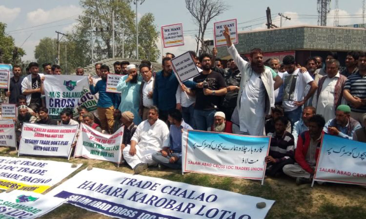 Scores of traders affiliated with Salamabad cross-LoC traders Union assembled at Park in Srinagar to demand resumption of the trade which was suspended on April 19 by the Union Home Ministry.