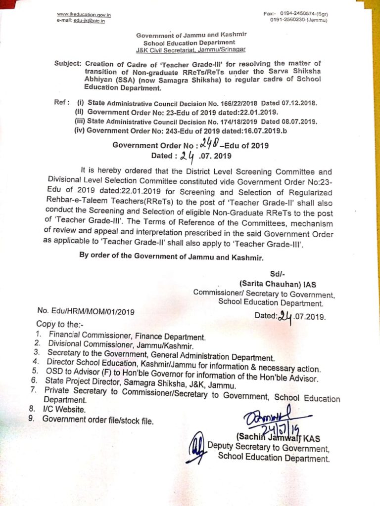 J & K Creation of Cadre of ‘Teacher Grade-3’ for resolving the matter of transition of Non- graduate RReTs/ReTs under the Sarva Shiksha Abhiyan (SSA)( now Samagra Shiksha) to regular cadre of School Education Department By Paigaam News - July 24, 2019 668 Facebook Twitter Google+ Pinterest WhatsApp Photo for representational purpose only.