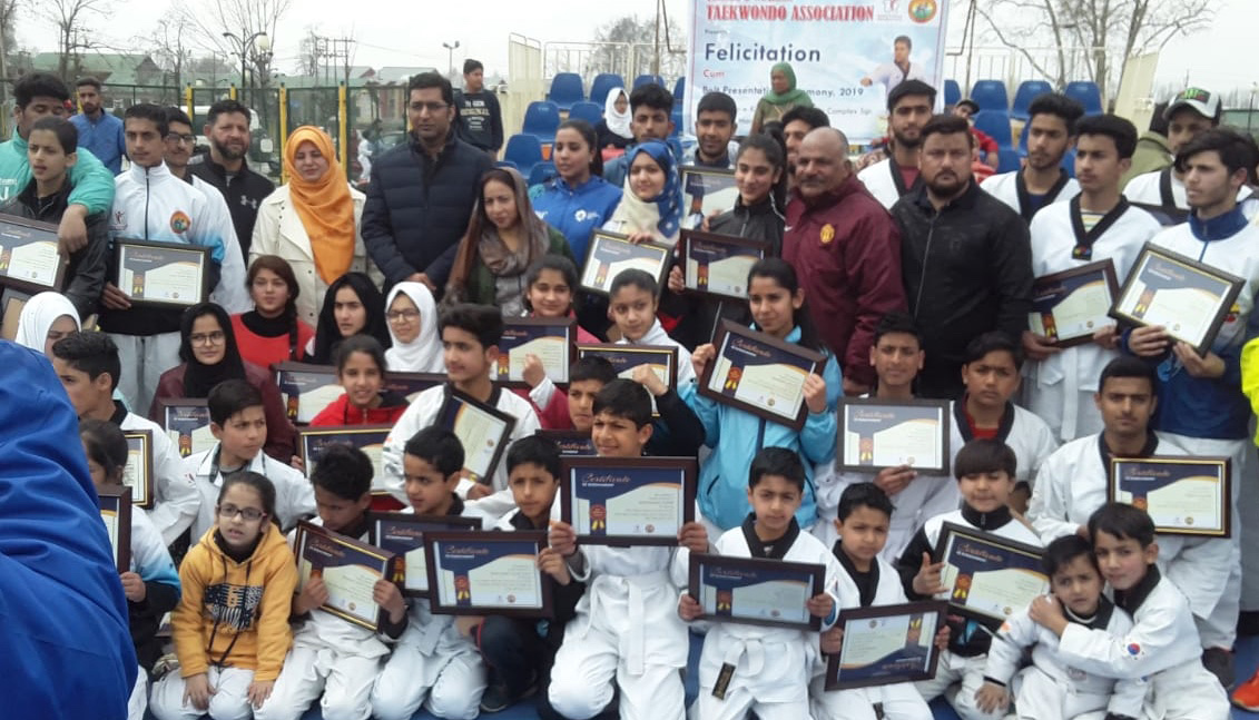 The felicitation programme was organized by the J&K Taekwondo Association. Vice President of the Association Nissar Hussain while speaking on the occasion said the programme was aimed at encouraging and promoting the Kashmir taekwondo athletes for national and international championships held in India and across the world