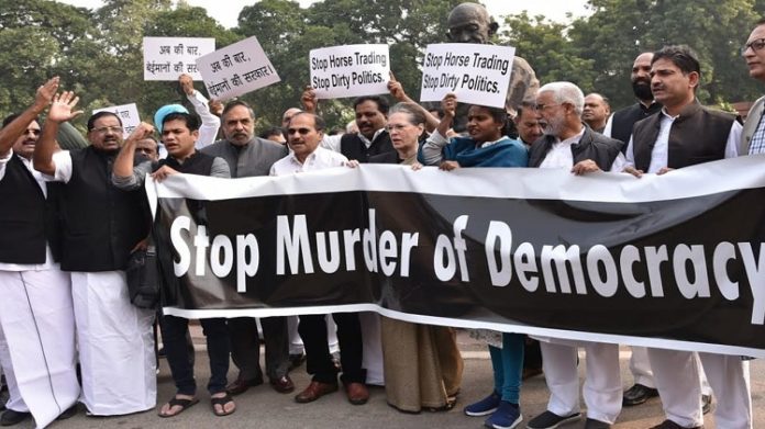 Calling the midnight coup in which the BJP sought to form a government with Ajit Pawar a “murder of democracy”, Congress leaders like Anand Sharma and Adheer Choudhury raised slogans and held placards criticising the BJP.