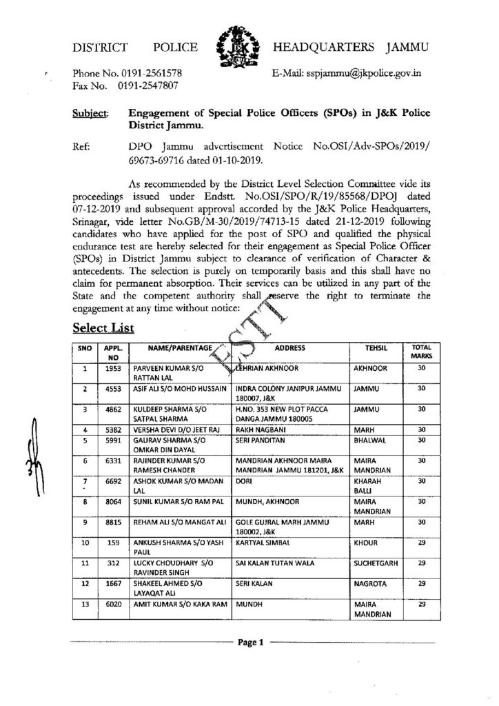 J & K Engagement of Special Police Officers (SPOs) in J&K Police District Jammu By Paigaam News - December 25, 2019 651 Facebook Twitter Google+ Pinterest WhatsApp Photo for representation only.
