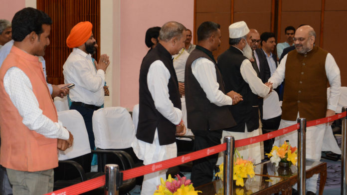 SRINAGAR, JUNE 27: On the second day of his visit, Union Home Minister, Amit Shah along with Governor, Satya Pal Malik interacted with a delegation of Sarpanches from all over the state here today.