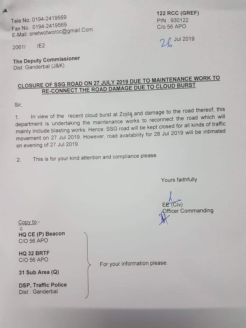 J & K CLOSURE OF SSG ROAD ON 27 JULY 2019 DUE TO MAINTENANCE WORK TO RE-CONNECT THE ROAD DAMAGE DUE TO CLOUD BURST By Paigaam News - July 27, 2019 760 Facebook Twitter Google+ Pinterest WhatsApp