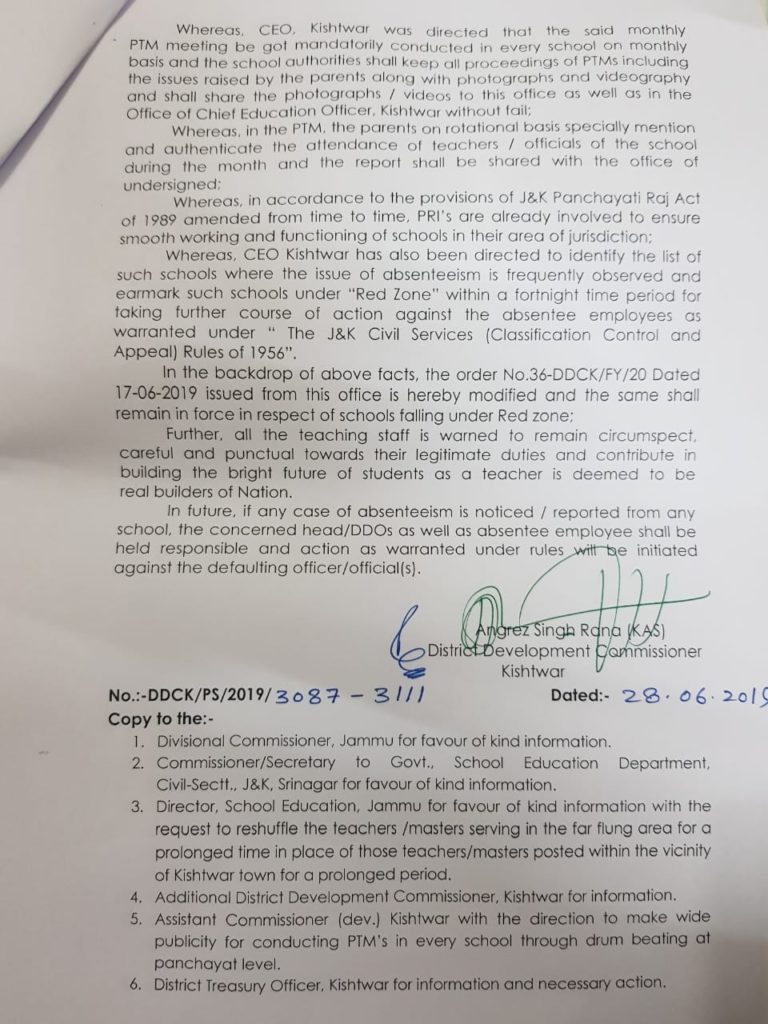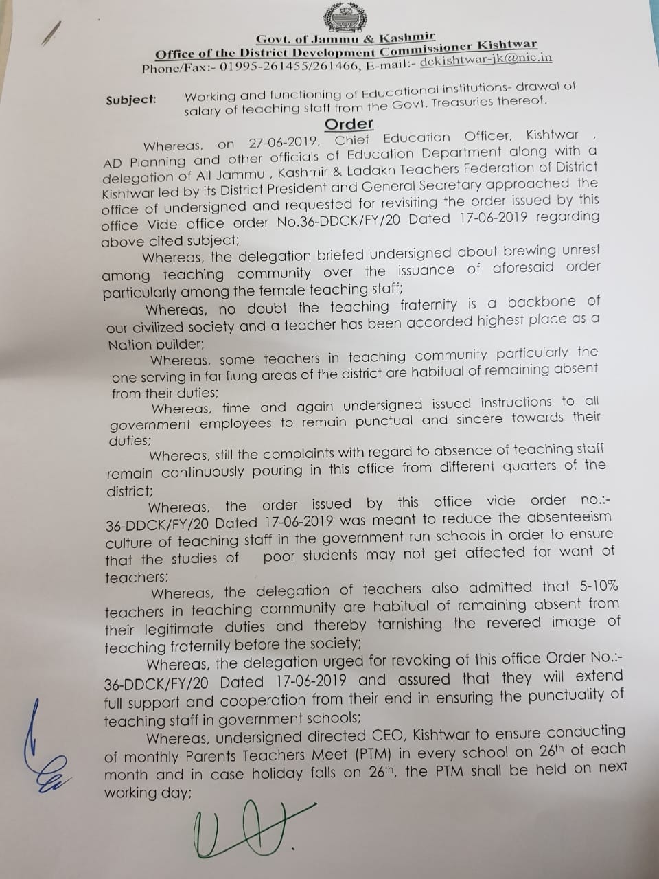 J & K BIG VICTORY FOR TEACHERS, DDC KISHTWAR MODIFIES THE CONTROVERSIAL ORDER By Paigaam News - June 28, 2019 755 Facebook Twitter Google+ Pinterest WhatsApp