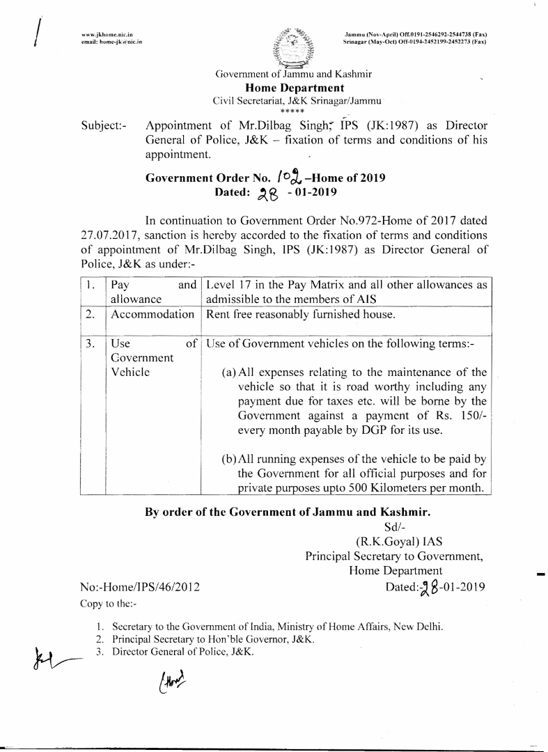 Appointment of Mr Dilbag Singh IPS as Director Genral of Police J&K Fixation of terms and conditions of his apponitment