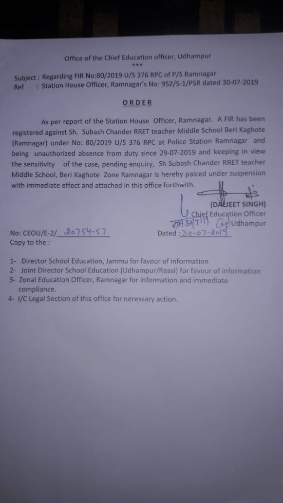 Jammu, July 30th: On the directions of Director School Education Jammu, Ms. Anuradha Gupta, the rape accused Subhash Chander RRET teacher has been put under suspension by CEO Udhampur Shri Daljeet Singh.