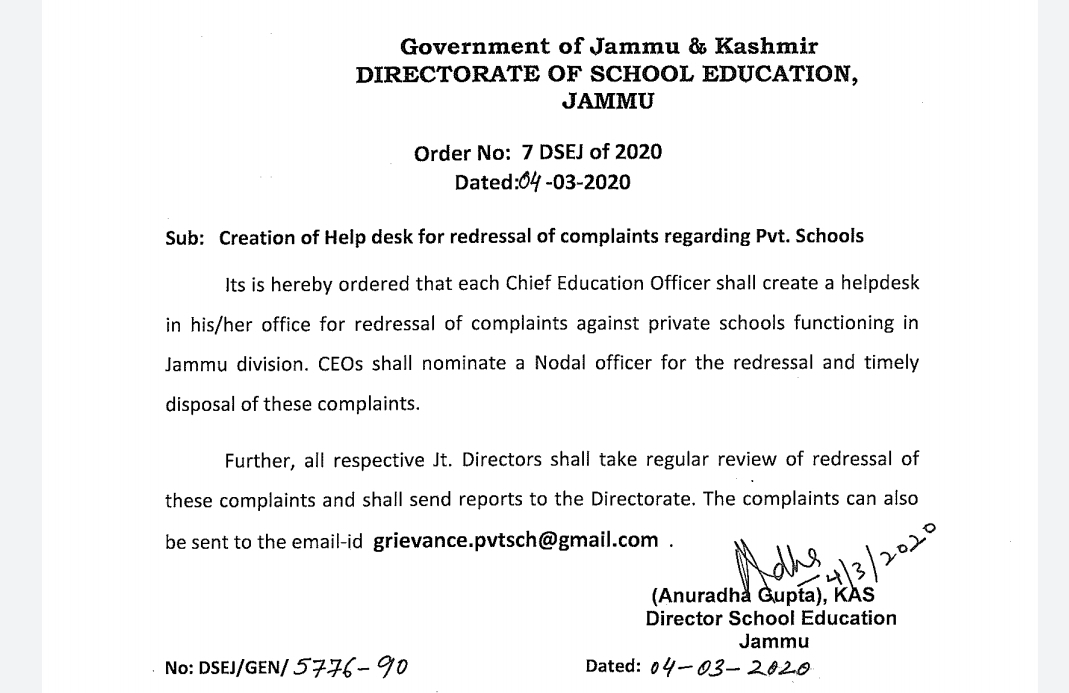 The order issued by the Director  School Education Jammu Ms. Anuradha Gupta reads “Its is hereby ordered that each Chief Education Officer shall create a helpdesk in his/her office for redressal of complaints against private schools functioning in Jammu division. CEOs shall nominate a Nodal officer for the redressal and timely disposal of these complaints.”
