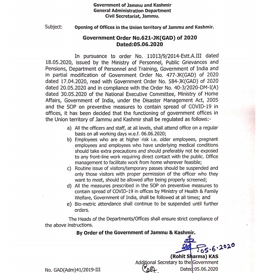 JAMMU, JUNE 5: The government offices in the Union Territory of Jammu and Kashmir shall function with all the officers and staff, at all levels, attending office on a regular basis on all working days with effect from 6th of June 2020.