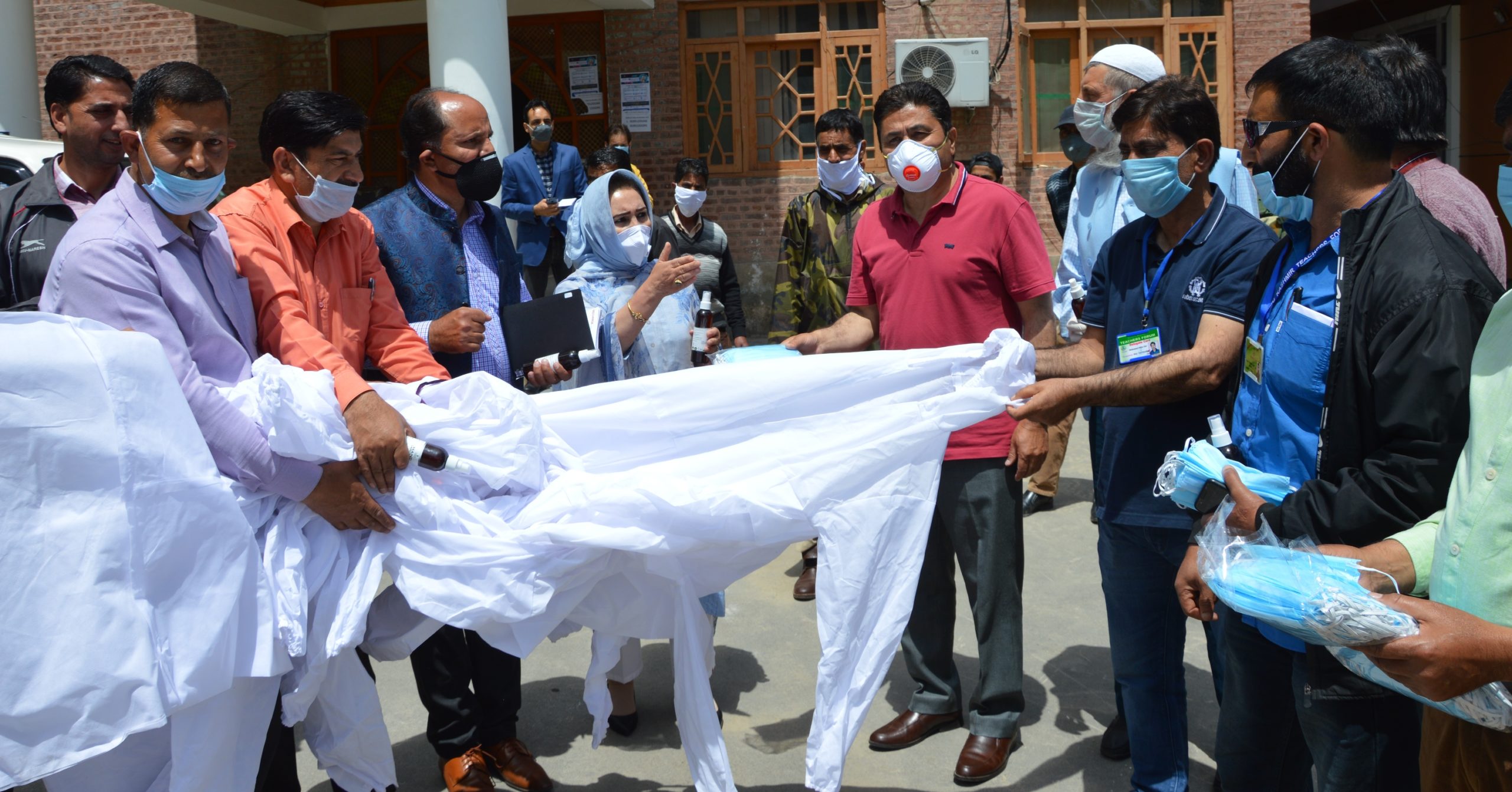 BUDGAM, MAY 05: The Deputy Commissioner, Budgam, Tariq Hussain Ganai in presence of CEO Budgam, Fatima Tak and representative of Jammu and Kashmir Teachers Forum and other concerned distributed 150 PPE kits, 150 packs of Masks and 150 hand sanitizers donated by Jammu and Kashmir teachers forum in collaboration with Education Department Budgam particularly Zone Khansahab under covid-19 pandemic relief, here today.