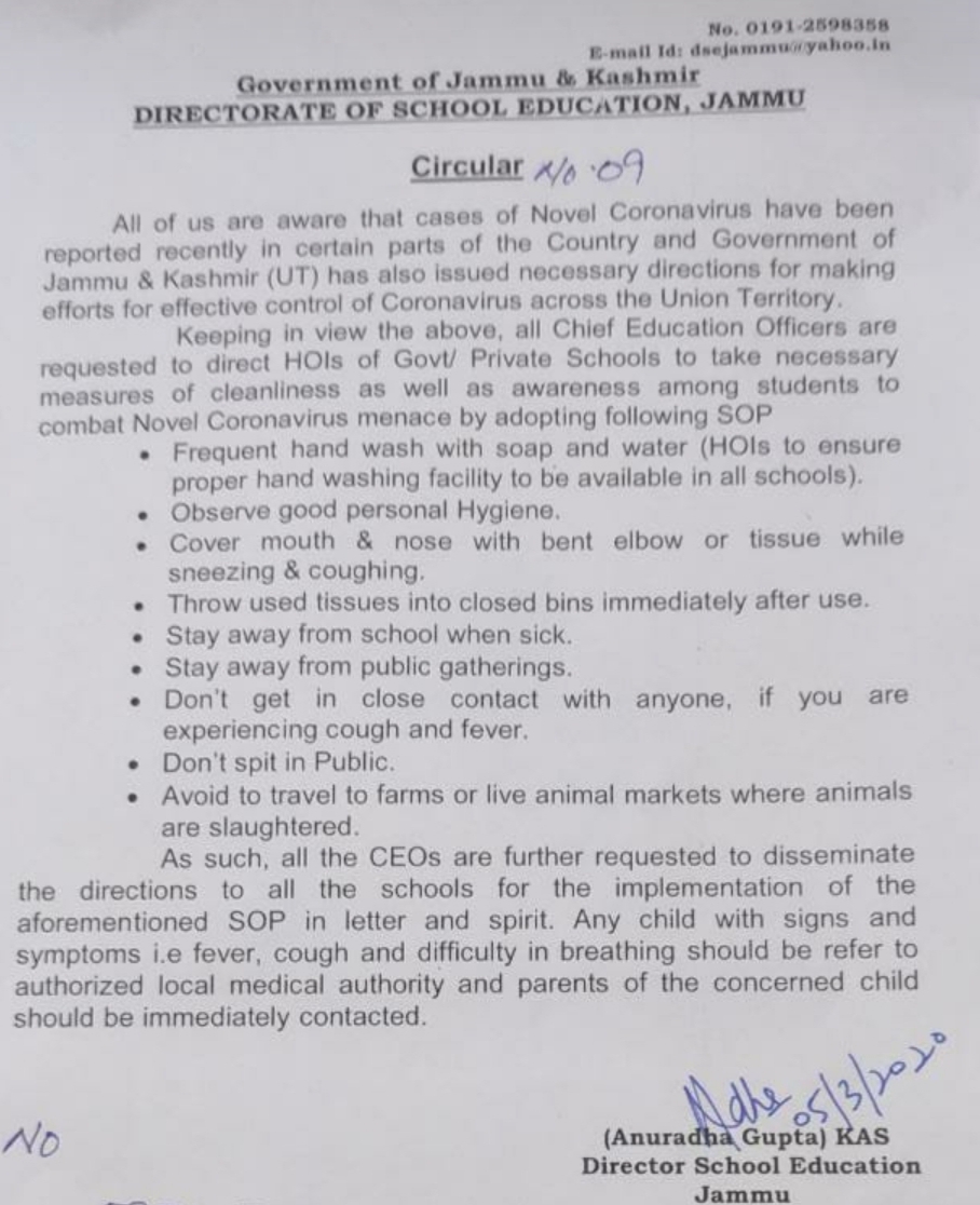 The circular issued by Director School Education Jammu Anuradha Gupta reads “All Chief Education Officers are requested to direct HOD of Govt/ Private Schools to take necessary measures of cleanliness as well as awareness among students to combat Novel Coronavirus menace”, by adopting the enlisted SOP.