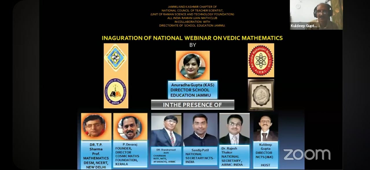 Jammu: Directorate of School Education Jammu organized a National Webinar on VEDIC MATHEMATICS in collaboration with National Council of Teacher Scientists (J&K CHAPTER)-India, a unit of Raman Science And Technology Foundation Gujrat, All India Ramanujan Maths Club India(Registered under Vipnet, Vigyan Prasar Department of Science and Tecnology Delhi) for the Teachers of Jammu and Kashmir to acquaint them with the importance of Vedic Maths and its utility for students.