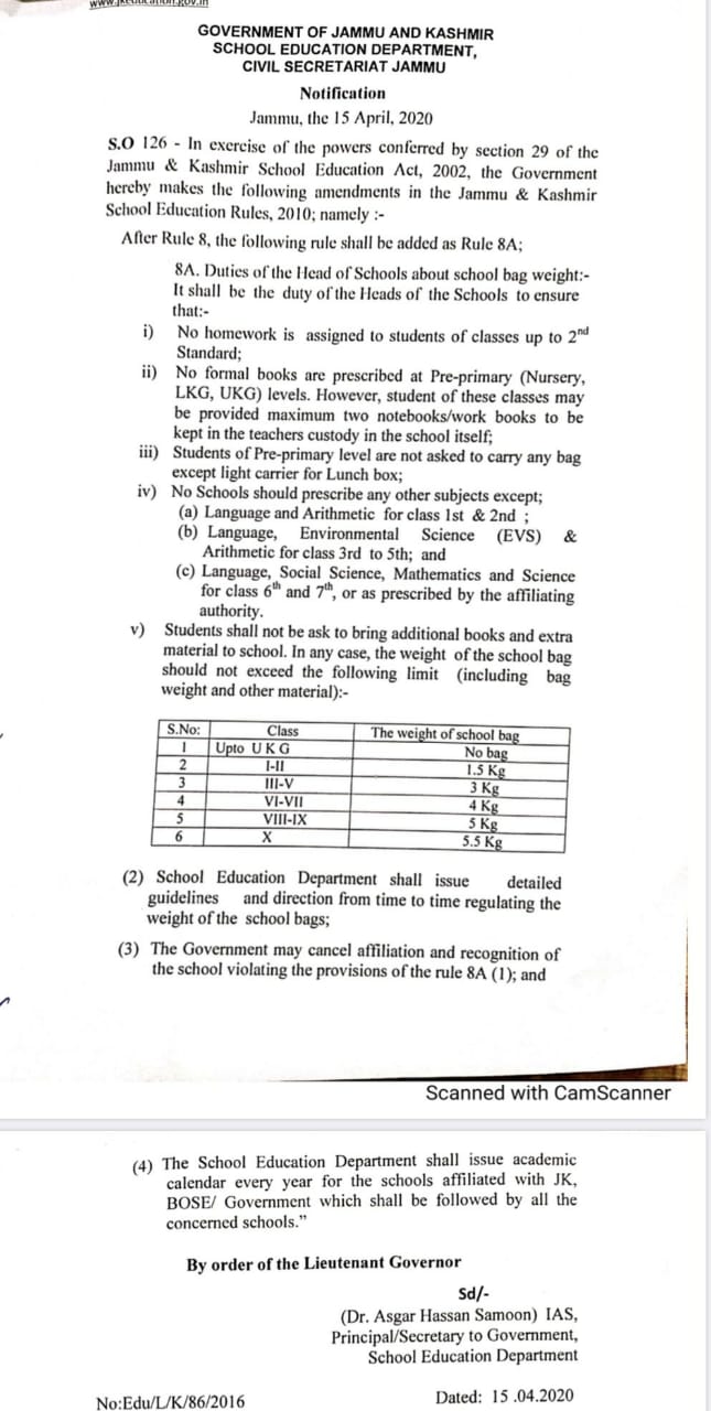 J & K J&K School Education Rules Ammended :No Homework Upto class 2nd, No Formal Books At Pre Nursery Level And Much More… By Paigaam News - April 16, 2020 735 Facebook Twitter Google+ Pinterest WhatsApp
