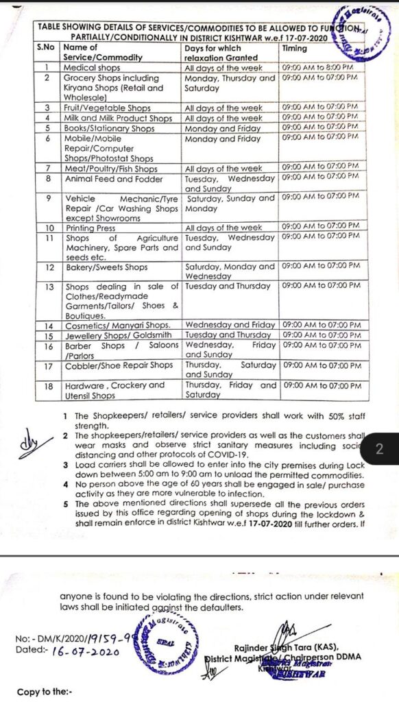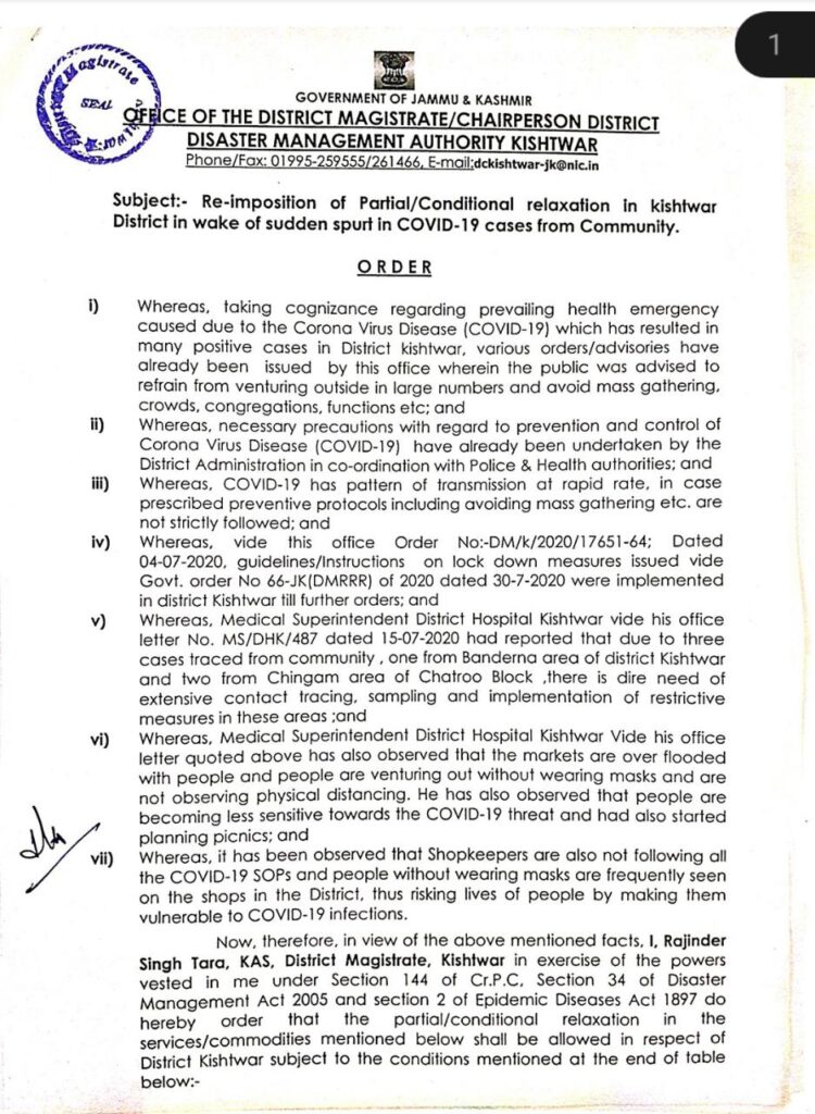 J & K Re-imposition of Partial/Conditional relaxation in kishtwar District in wake of sudden spurt in COVID-19 cases from Community By Paigaam News - July 17, 2020 435 Facebook Twitter Google+ Pinterest WhatsApp