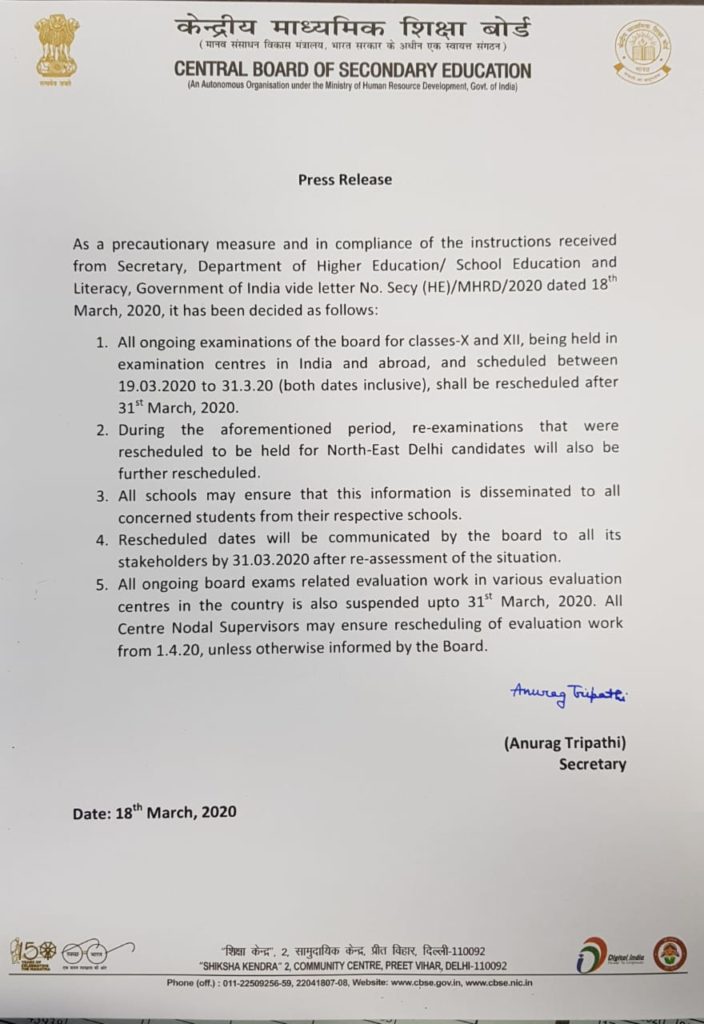 “All ongoing CBSE examinations in India and abroad postponed till March 31 and will be rescheduled thereafter… after an assessment of the situation,” CBSE Secretary Anurag Tripathi said.